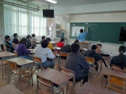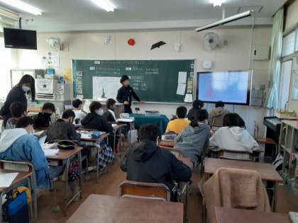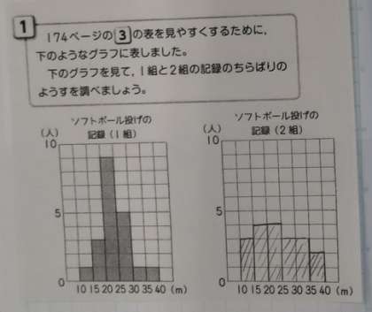 6年生は算数科で「資料の調べ方」の学習をしています。6年生では新たに「柱状グラフ」が登場してきました。本時では、2種類の柱状グラフを比べて、ちらばりぐあいについて考えていました。1組と2組のソフトボール投げの結果、ちらばり方はかなり違うようです。