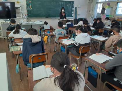 5年生は国語科で「大造じいさんとがん」を学習します。本時では、デジタル教科書の朗読を聴きながら、物語の情景を想像していました。朗読を聴きながら、難しい漢字や意味の分かりにくい言葉をチェックしていきます。また、登場人物の人物像を想像しながら聴いています。