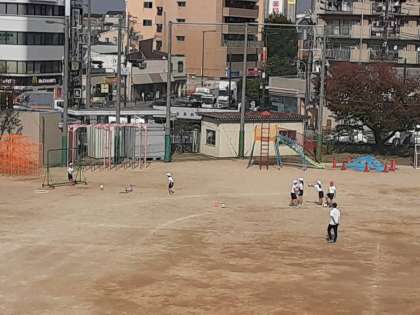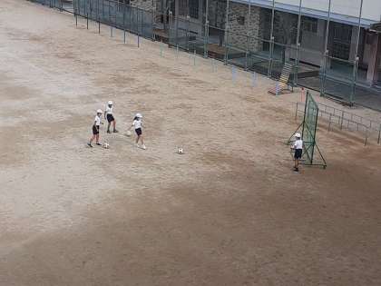 4年生は体育科で「サッカー」(ゴール型ボールゲーム)に取り組んでいます。2組では、まずドリブルで運動場を何周も回っていました。これで体は温まってきたようです。