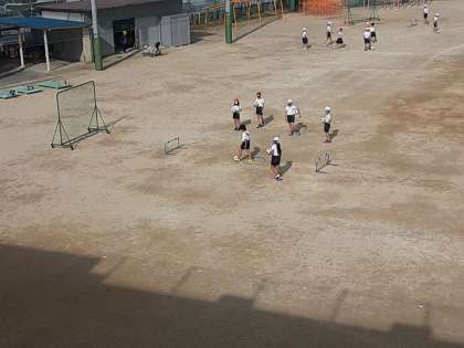 次にグループで分かれて練習をしていました。グループごとにチームのめあてや練習方法を話し合って、ホワイトボードに書いていました。運動場の袖に持ち込んで、確認しながら練習場をつくっていました。ネット・フラフープ・ミニコーン・ハードル、いろいろな器具・用具を活かして場の設定をしていました。もうすぐ試合でしょうか。