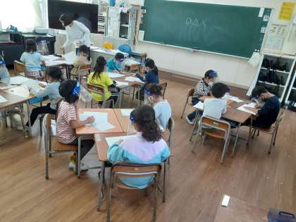 作文には「運動会」「遠足」「風鈴作り」についてが多かったようです。お友だちの作文を一所懸命に読んでカードに評価をつけていました。