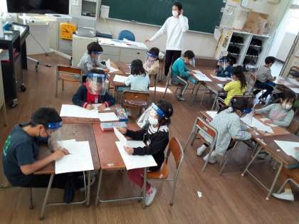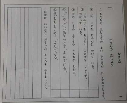 1年生では国語科で学校行事や学校生活について作文を書きました。2組では、グループになってお互いに作文を読み合って、よいところを見つける取り組みをしていました。カードに書かれている観点別に「〇・△・×」をつけていきます。