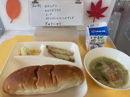 11月22日(月)の給食は、おさつパン・牛乳・わかさぎふフライ・スープ・カリフラワーとコーンのサラダです。ワカサギやししゃもなその魚は、骨から軟らかいため、頭からしっぽまで丸ごと食べることができます。魚を骨ごと食べると、カルシウムをたくさんとることができます。本日の「わかさぎフライ」は、噛み応えがあります。しっかりとよく噛んで食べてほしいと思います。