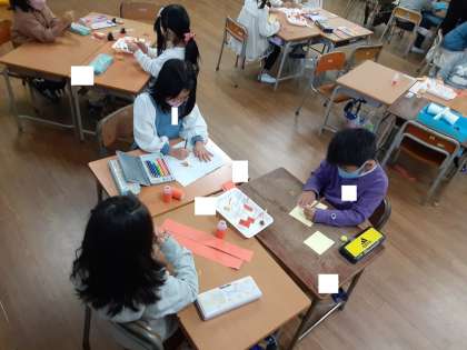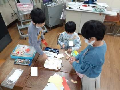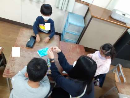 1年生は生活科で「たのしい あき いっぱい」を学習しています。1組では、秋祭りの準備をしていました。あるグループは、ヤクルトの容器にきれいな色紙を巻いて、ボーリングゲームを作っていました。また、プラスチックの皿に爪楊枝を指して、迷路をつくるグループもありました。ボーリングも迷路も、球に秋の素材を活用するようです。