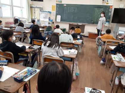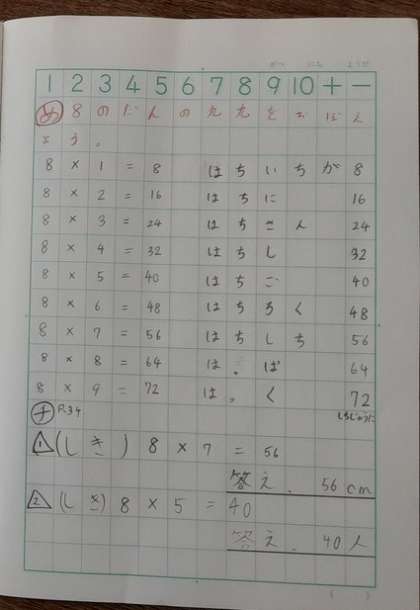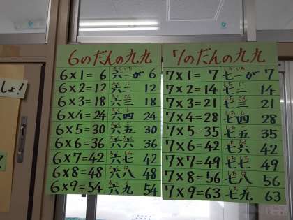 2年生は算数科で「かけ算」を学習しています。いよいよ大詰め8の段を前時に作りました。本時では、「8の段」九九の読み方を確認したり、文章問題や問題づくりなどチャレンジ問題に取り組んだりしていました。「はちろく48」「はちしち56」「はっく72」これまですらすら九九を唱えられていても、「7の段」「8の段」で苦戦する児童も出てきているようです。そんな中で「はっぱ64」のところは、なぜか滑らかに読めていました。唱えやすいのでしょうか。壁面には「6・7の段の九九」が貼られています。がんばれ、2年生。