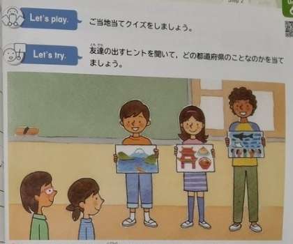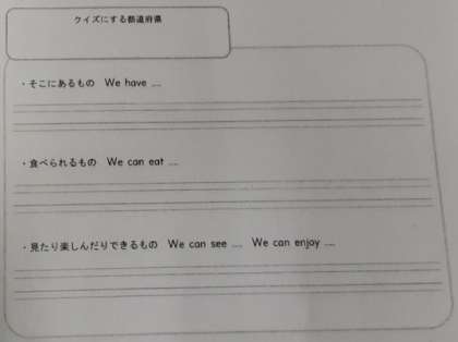 6年生は英語科で「各地でできることを伝えよう」を学習していました。「We have ○○.」「We can eat ○○.」「We can see ○○.」「We can enjoy ○○.」各地の名所やご馳走、行事など、いろいろな都道府県のクイズを作っていました。友だちの出すヒントを聞いて、どこの都道府県なのかを当てます。