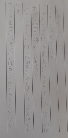 それでは実際に案内文を書いていきます。もう終わりましたが、運動会の案内文を描いた児童が多かったようです。