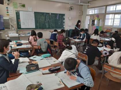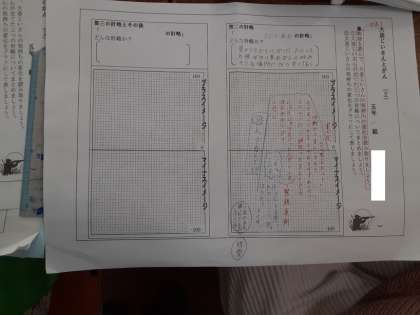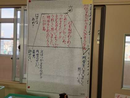 5年生は国語科で「大造じいさんとがん」の学習をしています。大造じいさんは雁を捉えようとするのですが、残雪のためにうまくいきません。そこで、3つの計略を仕掛けました。時間の経過と大造じいさんの気持ちの変化を読み取り、グラフに表していました。