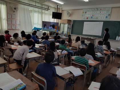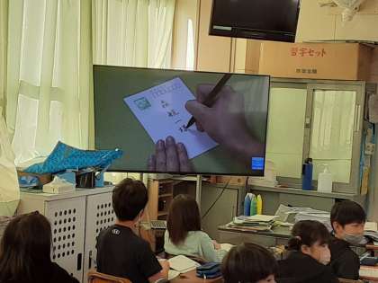 3年生は国語科で「案内の手紙を書こう」の学習をしています。本時では、封筒にあて名や住所などを書く練習をしていました。ビデオや教科書の手本を見ながら、あて名・住所の書き方を学んでいました。送る相手は山内先生を想定して書いていました。