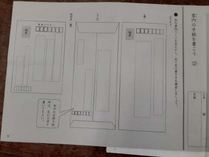 次は封筒裏面の書き方を学びます。児童から質問がありました。「自分の住所がわかりません。」そこで、先生から各児童の住所が記入された紙が配られました。「個人情報なので人には見せないこと。」この注意のあと書き始めました。