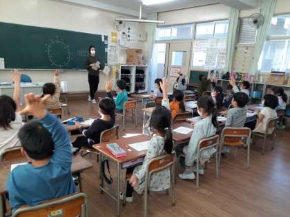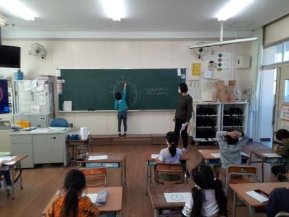 1年生では算数科で「とけい」を学習しています。1学期には、「何時・何時半」まで習っていますが、今回は「何時何分」までの読み方を学びます。長針と短針とでは、1めもりの大きさも意味も全く違ってきます。長針が「1」のめもり、「2」のめもりを指すとそれぞれ何分になるのか、ワークシートが配られしっかり思い出しました。