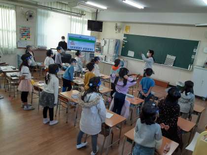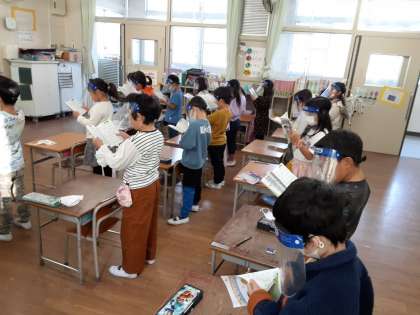 1年生は音楽科で歌集「みんなの うた」を活用しています。1組の教室から「ア・ア・ア・ア・ア・ア・ア・ア・アー」とオルガンに合わせて発声練習をしている声が聞こえてきました。透き通ったきれいな声でした。その後、「となりのトトロ」の歌声が聞こえてきました。リズムに乗った歌声でした。