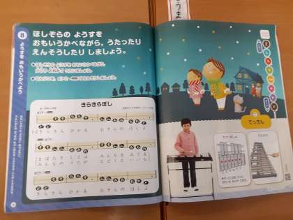 さあ、発声練習は十分しました。音楽の教科書「きらきらぼし」の歌を練習します。「ド・ド」から「ソ・ソ」のフレーズがスムーズに歌えていました。
