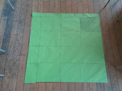 昨日4年2組では1平方メートルの正方形に方眼を敷き詰め、1平方メートルの広さを体感しました。本時では、1辺1cmの方眼を敷き詰めました。