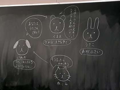 4年1組では学級活動の時間に先生のお話を聞いていました。発表の声が小さい「うさこ」がいます。「くまお」は「代わりに自分が大きな声で発表しよう。」と考えます。そんな「くまお」に対して、「いぬお」は「あなたは、うさこさんですか?」と問うてきます。そう言う「いぬお」に対して「ねこみ」は「そう言ったら、うさこがかわいそう。」と言います。