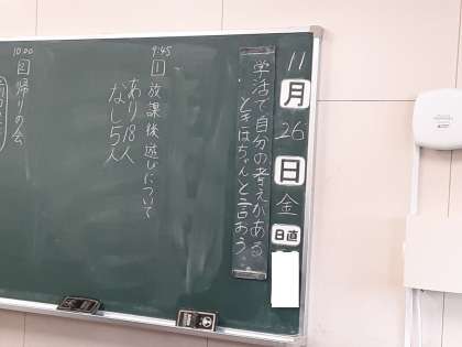 「放課後遊び」について、本校では法放課後用具を職員室から借りて運動場で遊ぶことができまるので、学級として取り組もうとしています。賛成が多いようですが、問題点について話し合っていました。
