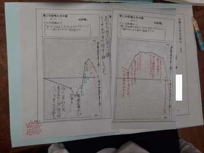 大造じいさんの思いをプラスイメージかマイナスイメージかグラフで表し、理由も書き入れていました。収支プラスの児童もいれば、一時マイナスになり最終的に「0」という児童もいました。そう考えた理由について話し合っていました。