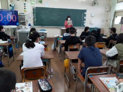 5年生では先生がおすすめの本のお話をしてくれていました。「マンガでおぼえる百人一首」の本に関して、話が盛り上がっていました。100首全部覚えている児童はいませんでしたが、それぞれ好きな歌があるようです。「今年もカルタ大会ができなかったら、学級でしたい。」という声が挙がりました。