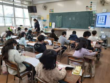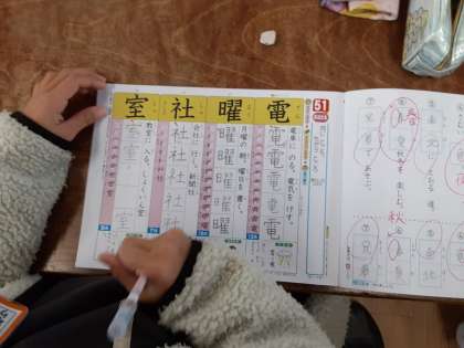 2年生は国語科で新出漢字「電」「曜」「社」を習っていました。「電」は、「あまかんむり」と下の部分とのバランスが難しいようです。次は「曜」です。19画もあります。しかも「ふるとり(隹)」の書き順がややこしいようです。字の大きさのバランスもとりにくいようです。がんばって漢字ドリルに練習していました。