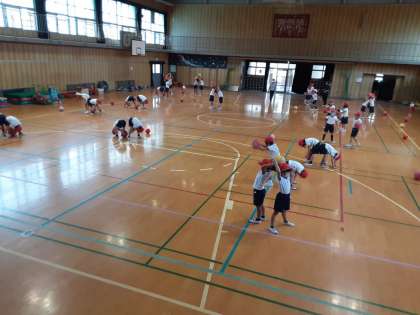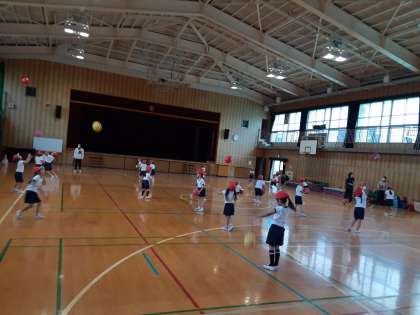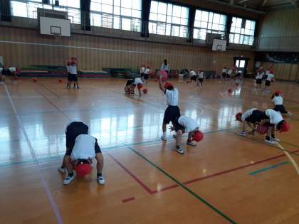 1年生が体育科で「ボールあそび」に取り組んでいました。1人1球ずつボールが配られました。まずは、ボールに慣れるようにします。真上に3回ボールを投げます。1回目は低く、2回目は少し高く、3回目はもっと高く投げます。真上に投げるのが難しいようで、高く投げようと力を入れると、斜めに変な方向へ行ってしまうようです。