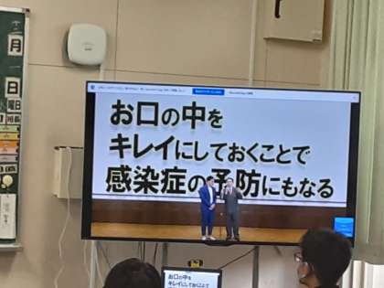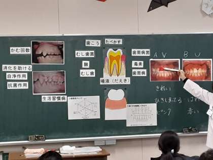 6年生を対象に「歯と口の健康教室」を実施しました。市教委から歯科衛生士の先生と本校の校医先生にお越しいただきました。噛む回数が多いと唾液が多く分泌され「消化を助ける」「自浄作用」「抗菌作用」など良いことが多いことを学びました。30回は噛む必要があるそうです。また、虫歯と同じくらい、いや、それ以上に怖い歯周病についても教えていただきました。これからは、虫歯と同様に歯ぐきの状態にも気を配ってほしいと思います。最後に、お笑い芸人による「歯磨きの大切さを語る漫才」を観ました。