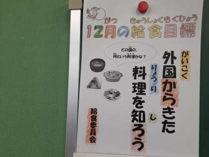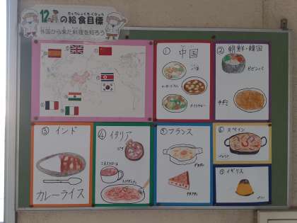 12月の給食目標は「外国からきた料理を知ろう」です。掲示板には、中国・韓国朝鮮・インド・イタリア・フランス・スペイン・イギリスからきた料理が紹介されていました。すでに給食で登場した献立がいくつもあります。今月も、プリンやカレーライスが登場します。