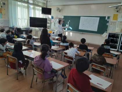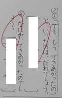 1年生では国語科で学習した「サラダで げんき」のテストが返却されていました。(2)2の答えは「サラダ」です。「さらだ」とひらがなで答えてしまってはいけません。正しく本文から引用するように説明がありました。
