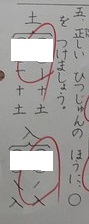 「土」「入」の書き順も間違いやすいです。「王」や「人」の書き順に惑わされないように気をつけてほしいです。