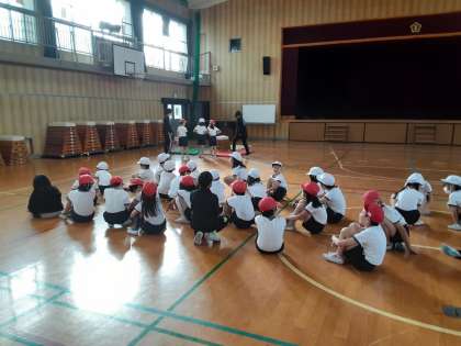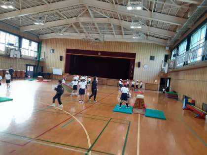 3年生は体育科で「とび箱」に取り組みます。本時は最初なので、主に場の設定について確認していました。3段・4段・5段の跳び箱をそれぞれどの場所に置くのか、跳び箱の周りにマットをどのように配置するのか、踏切板をどのように置くのかを確かめました。