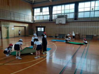 次は片づけです。とび箱は同じ色の台に積むことに気をつけるように注意がありました。