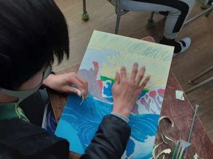 浮世絵 公開日 2021/12/09 更新日 2021/12/09 お知らせ 6年生は図画工作科で「浮世絵」の作成に取り組んでいます。下描きの段階で、味のある絵になっていました。着色は、絵の具ではなく砂絵の技法を使っていました。13色の砂を混ぜたり、少しずつ変化させるグラデーションにしたりして、水彩絵の具とは全く違う世界を表現していました。 完成した作品は、ぜひ作品展でご覧ください。 いいね(0)