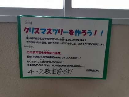 クリスマスツリー1 公開日 2021/12/09 更新日 2021/12/09 お知らせ 廊下の何か所かに、下記のような張り紙がありました。そういえば、4年2組の前には大きなツリーが……。 いいね(0)
