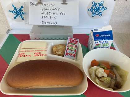 12月14日(火)の給食は、黒糖パン・牛乳・とうふハンバーグ・カリフラワーのスープ煮・スライスチーズです。カリフラワーには、「キャベツの花」という意味があります。キャベツと同じ種類の野菜で、11月〜3月頃にたくさん獲れて美味しくなります。カリフラワーにたくさん含まれているビタミンCには、傷が治りやすくなる働きがあります。