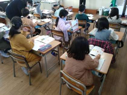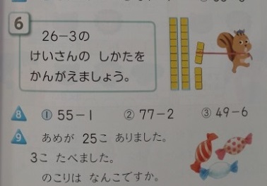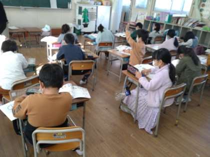 1年生は算数科で「たしざん ひきざん」を学習しています。1組では、くり上がりのない「(2位数)+(1位数)」「(2位数)−(1位数)」の文章問題について取り組んでいました。前時までに計算の仕方については学んでいるので、次々に問題をこなしている様子でした。タイルを使わなくても、正確に計算できるようになってきてるようでした。
