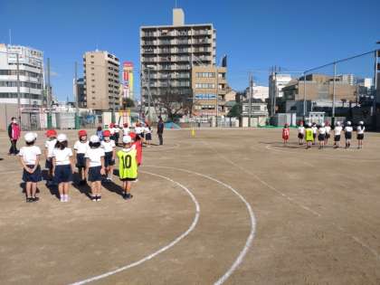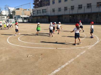 ころがしドッジボール 公開日 2021/12/14 更新日 2021/12/14 お知らせ 1年生は体育科で「ボールあそび」に取り組んでいます。本時では、ころがしドッジボールをしていました。攻撃チームが円の外に並んで、中にいる相手チームを狙ってボールを転がします。一定時間が来たら攻守交替して、当てた人数の多いチームが勝ちとなります。 開始前に、並んであいさつをします。円の外に逃げたり、うっかりボールを受けてしまったりしていましたが、ルールがわかってきて、ゲームらしくなってきました。 いいね(0)