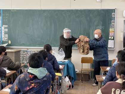 80年前に使っていたリュックサックを見せていただき、芋の買い出しに行った話を聞かせていただきました。