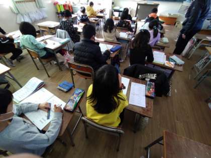 2年生では算数科で「かけ算」の学習をしてきました。九九を全部習い終えて、本時ではまとめの練習問題に取り組んでいました。7の段を覚えきるのが難しいようです。