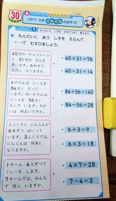 下記のように文章問題が並ぶと、たし算なのか、ひき算なのか、戸惑っていました。4問目に「なんばい」という言葉が登場します。今はかけ算を習いたてなのですぐに「かけ算」とわかるようですが、この先ずっと忘れないでほしいです。さらに下記のようなかけ算のきまりを問われることがあります。きまりの理解もがんばってほしいです。
