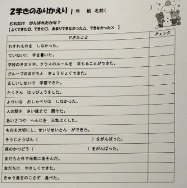 1年2組では「2学きの ふりかえり」をしていました。下記のような項目が並んでいた「◎○△」で自己評価します。全部◎や○の児童もいれば、△をいくつか書いている自分に厳しい児童もいました。「わすれものをしない」「よけいなおしゃべりをしなかった」この項目で、△が見られました。