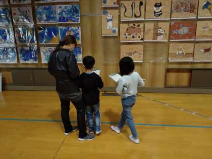 12月17日(金)2時限目に2年生が作品展の見学をしていました。その学年の作品もよくできていて、時間をかけてじっくり見て回っていました。ワークシートをもって、自分が心に残った作品について書き留めていました。特に6年生のオリンピックや砂絵が人気で、作品の前に子どもたちが集まり、驚きの声をあげていました。