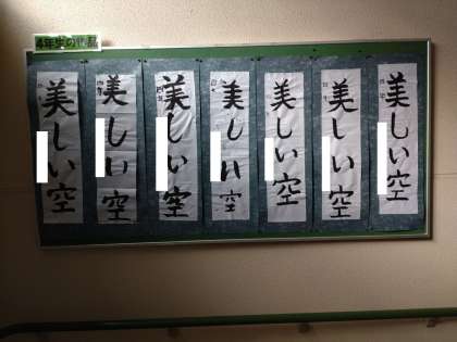 4年生の掲示板に「美しい空」と書かれた書き初めが掲示されていました。「美」は画数が多く、「し」「い」はひらがなで画数が少ないので、字のバランスをとるのが難しかったかもしれませんが、まさしく「美しい」字が書かれていました。