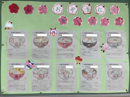 給食室横の掲示板に「こんなおぞうにを食べました」の題で、子どもたちが自分の家で作ってもらったお雑煮について紹介されていました。野菜が中心のあっさりしたお雑煮、お肉やカニ・エビが使われた食べ応えのあるお雑煮、お出汁がしっかりと効いているお雑煮など、各ご家庭で特徴があることがわかりました。きっとふるさとの味つけなのでしょうか。