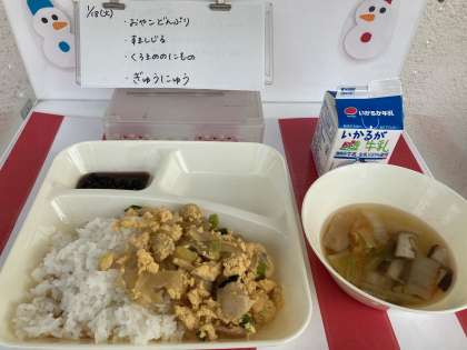 1月18日(火)の給食は、親子丼・牛乳・すまし汁・黒豆の煮ものです。親子丼は卵の個別対応食です。黒豆は、お正月に食べるおせち料理の1つです。