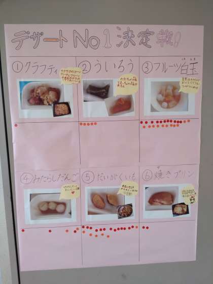 デザート ナンバー1決定戦 公開日 2022/02/04 更新日 2022/02/04 お知らせ 給食でこれまで出されたデザートの中で、児童の投票によってナンバー1を決めます。「クラフティ」「ういろう」「フルーツ白玉」「みたらしだんご」「焼きプリン」が候補です。今のところ「フルーツ白玉」と「だいがくいも」が接戦のようです。結果はどうなるでしょうか。 いいね(0)