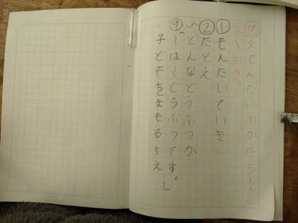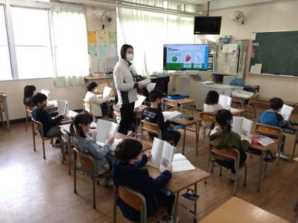 1年生は国語科で「子どもを まもる どうぶつたち」の学習をしています。2組では、全体の文章の構成について考えていました。先生からは「文ぜんたいの かたちを しらべよう」と投げかけられました。文章全体を10の段落に分け、子どもたちはそれぞれの文頭に(1)〜(10)までつけています。(1)は問題提起、(2)〜(9)は「どんな動物か」の説明、(10)は……。のように話し合っていました。