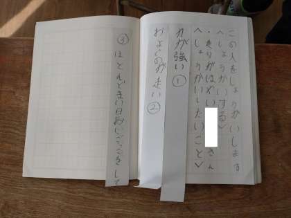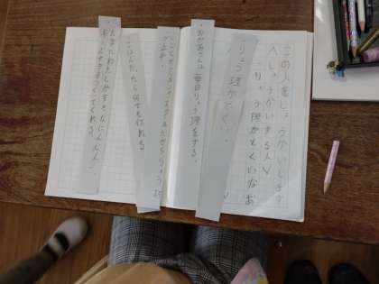 2年生は国語科で「しょうかいする 文しょうを 書く」に取り組んでいます。紹介したい人について文章を書きますが、その際に文章の組み立てを考えます。「はじめ」は紹介したい人がどんな人か、「なか」は紹介したい人の出来事などを事柄ごとに分けて、「おわり」は思っていることや読み手へ伝えたいことを書き表します。
