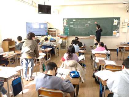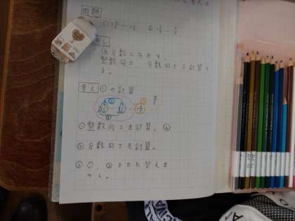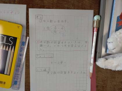 4年生では算数科で「分数」について学習しています。1組では、分母が等しい帯分数のひき算について考えていました。子どもたちは「整数どうし、分数どうしで計算する。」「仮分数にしてから計算する。」2通りの見通しを立てて考えていきました。どちらの方法をとっても正確に解けば答えは同じようです。