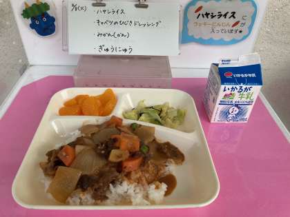 2月8日(火)の給食は、ハヤシライス・牛乳・キャベツんひじきドレッシング・ミカン(缶)です。
