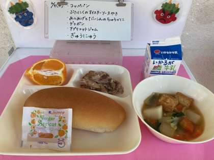 2月9日(水)の給食は、コッペパン・アプリコットジャム・牛乳・豚肉のオイスターソース焼き・厚揚げとダイコンの中華煮です。