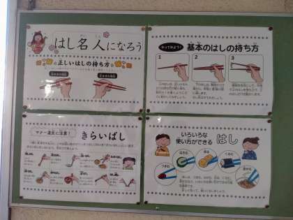 掲示板に「はし名人になろう」の題で、はしの正しい持ち方・マナーがよくないはしの持ち方・多様なはしの使い方が紹介されていました。給食では献立によって、はしを使う日とスプーンを使う日があります。どちらかと言うと、はしを使う日の方が多いでしょうか。正しい使い方を学んでほしいと思います。